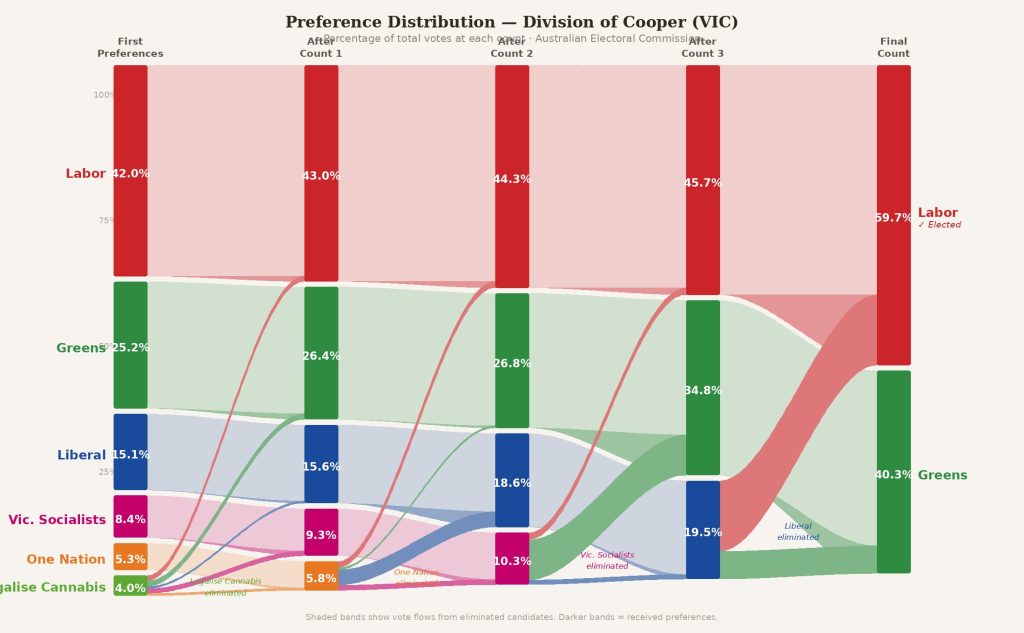 The key story it tells: Legalise Cannabis preferences split fairly evenly across the field; One Nation preferences broke heavily to Liberal (53%); Victorian Socialists preferences went overwhelmingly to the Greens (78%); and Liberal's final preferences split ~72/28 to Labor, delivering Ged Kearney the seat. History shows that an incumbent with less than around 42% of the first preference vote can be replaced by a good Community Independent candidate.